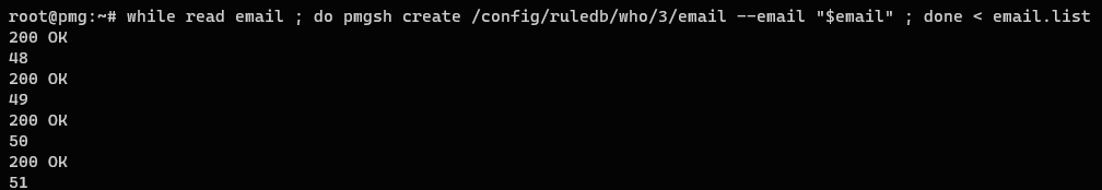 1while read email ; do pmgsh create /config/ruledb/who/3/email --email "$email" ; done < email.list