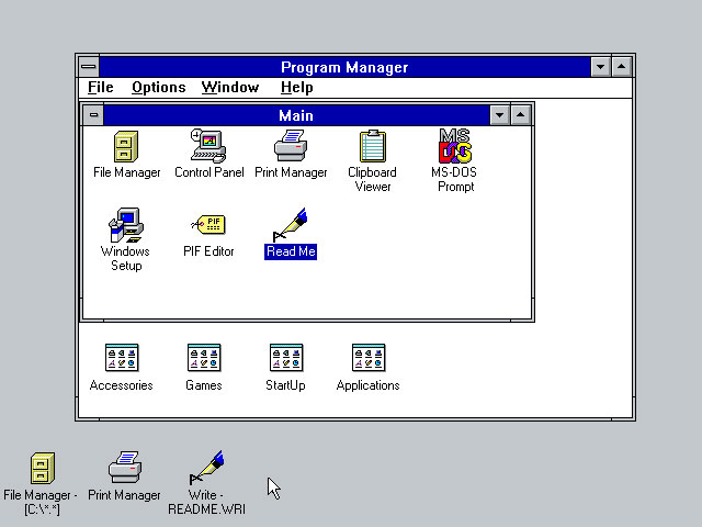 Основным окном, открываемым при входе в систему, был Program Manager, который давал доступ к программам, утилитам и расположениям данных. Свернутые окна отображались как значки на "рабочем столе", хотя рабочего стола в современном понимании еще не существовало, вы не могли расположить на нем свои файлы, папки или ярлыки. При закрытии Program Manager сеанс работы с Windows прекращался.