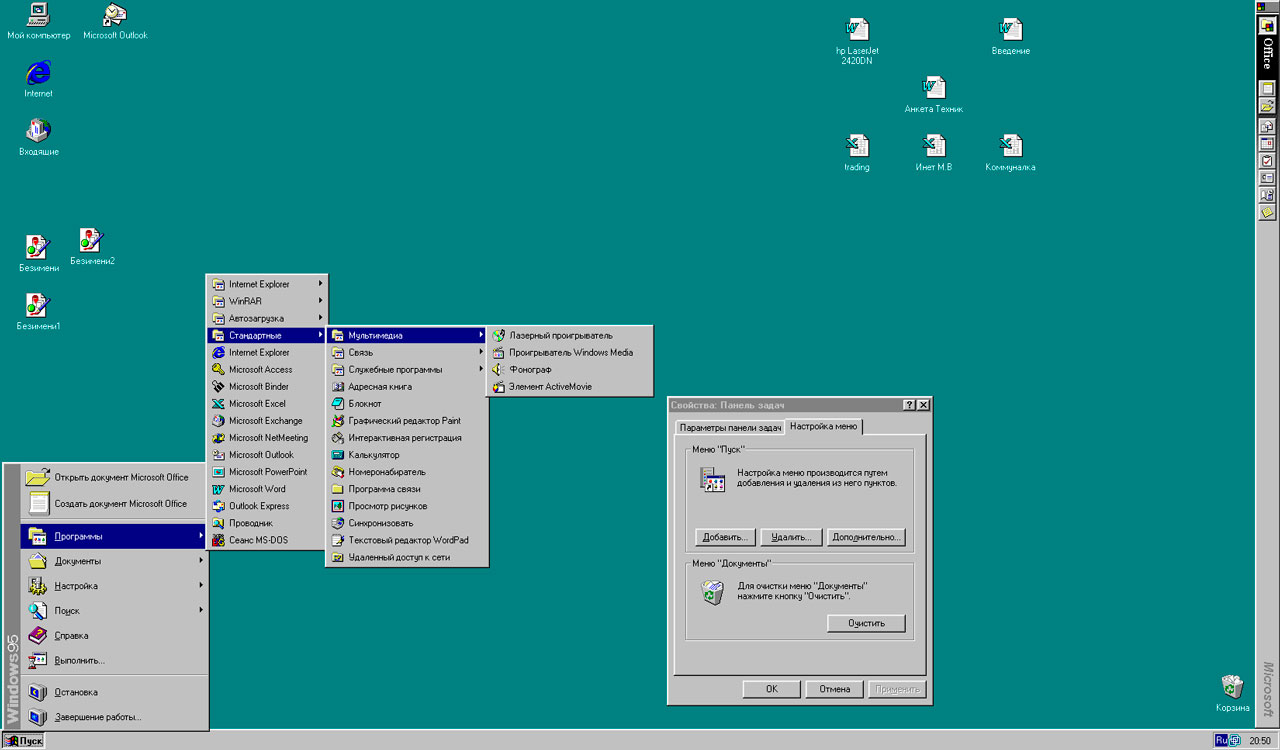 Новый интерфейс был представлен в Windows 95. Здесь впервые появился Рабочий стол, где пользователь мог размещать свои документы и ярлыки, панель задач, где отображались все запущенные приложения и конечно же кнопка Пуск, которая представляла единую точку доступа к программам, документам и настройкам системы.