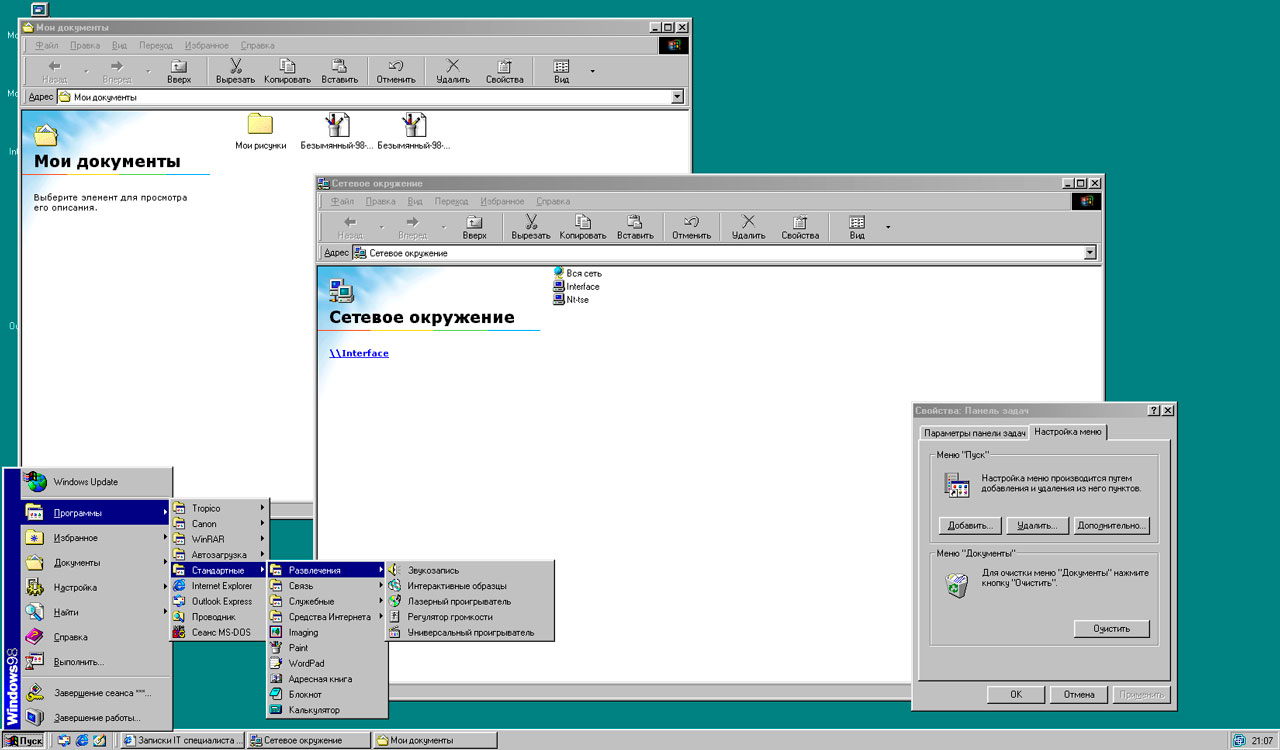 Этот же интерфейс без существенных изменений перешел в Windows 98. Были добавлены панель быстрого запуска и более глубоко интегрированы в систему сетевые возможности. Также появилось сворачивание раздела Программы в меню Пуск, когда система прятала редко используемое ПО, облегчая доступ к часто используемым программам. Удобным новшеством стала возможность добавлять элементы меню перетаскиванием значков, а также изменять их положение аналогичным образом.