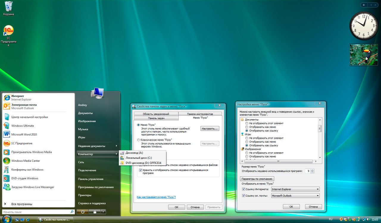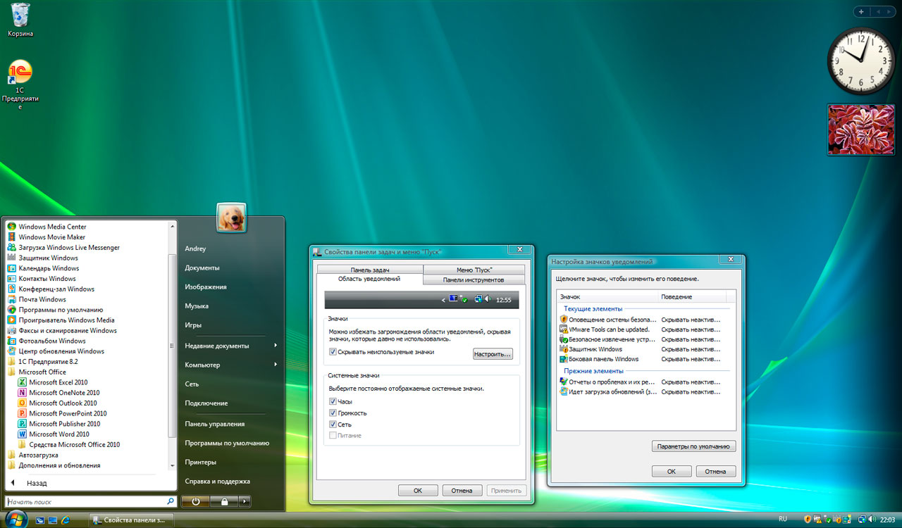 Сразу обращает на себя внимание новое двустворчатое меню Пуск, слева вверху отдельно закреплены ярлыки браузера и почтового клиента, показывающие, что интернет ныне не роскошь, а повседневный рабочий инструмент. Ниже расположен список часто используемых программ, теперь вам не надо каждый раз искать их в меню или загромождать ярлыками рабочий стол. Кроме того, список интерактивен, если ваши приоритеты в работе изменятся, то изменится и содержимое списка.