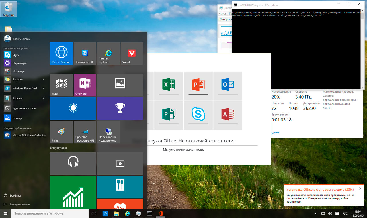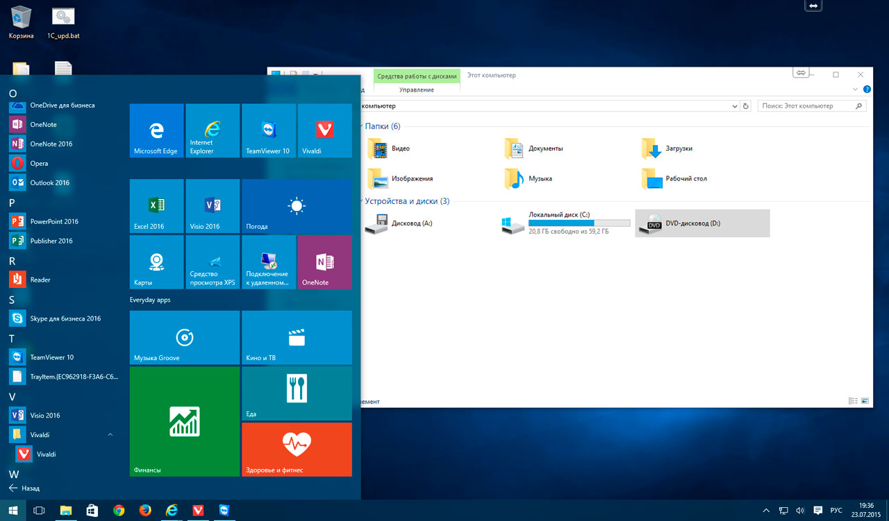 Список программ внешне повторяет аналогичный экран Windows 8 с сортировкой по алфавиту, хоть это и не всегда удобно. Так браузер Vivaldi логично спрятался в одноименную папку, а приложения нового Office равномерно размазало по всему меню, поместив при этом дополнительные инструменты в отдельную папку в другом месте. Если с привычными приложениями это не доставляет неудобств, то с новыми способно вызвать нешуточные затруднения в поиске всех компонентов только что установленного пакета.
