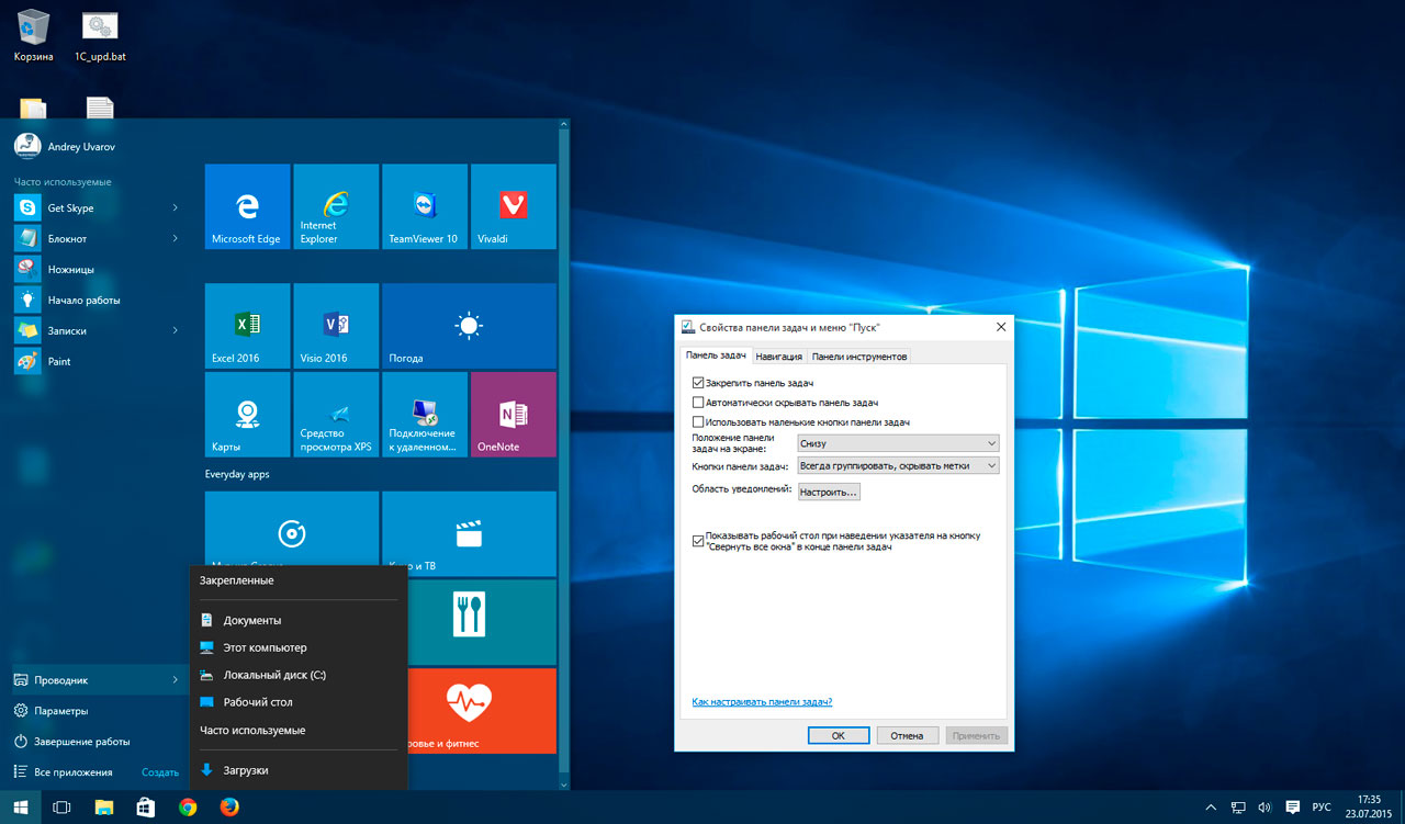 Расположения сократились до меню Проводник и ссылки Параметры, которые перекочевали в нижнюю часть меню к кнопке завершения работы и списку всех приложений. Меню Проводник является настраиваемым, вы можете закрепить в нем любые расположения, достаточно перетащить папку на панель задач и выбрать Закрепить в Проводник (орфография сохранена). Еще одно спорное новшество: подменю и списки переходов теперь не разворачиваются при наведении мыши, только по клику. Скорее всего это сделано в угоду мобильным пользователям, чтобы избежать ложных срабатываний при кратких касаниях.