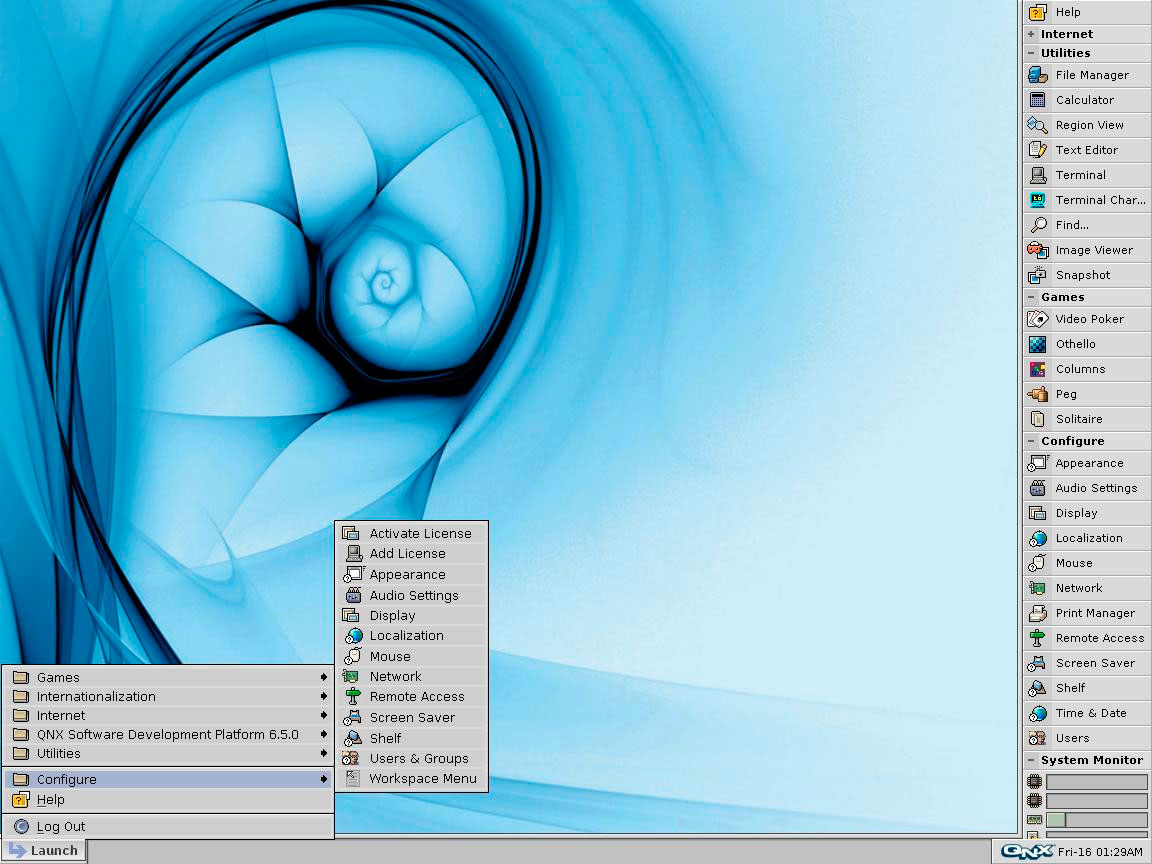 Как мы уже говорили, меню Пуск оказало значительное влияние на развитие пользовательских интерфейсов. Аналогичное построение рабочего пространства мы можем обнаружить в самых различных системах, например,QNX (коммерческая ОС реального времени). Разработчики не стали мудрить и просто назвали свой вариант меню Запуск (Launch).