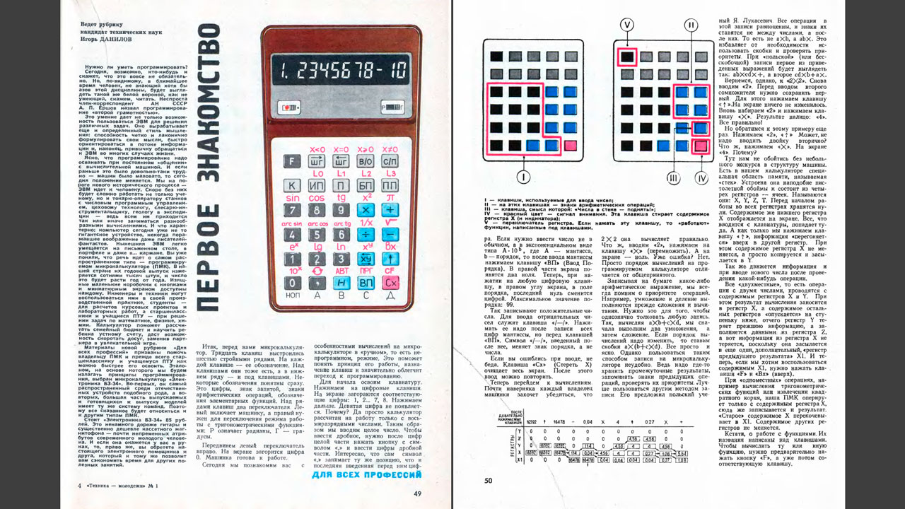 В январском номере популярного журнала Техника-Молодежи за 1985 год появилась новая рубрика "Для всех профессий", которая обучала работе с программируемым калькулятором Б3-34 и хотя подобные рубрики были в других журналах, например, Наука и жизнь именно Техника-Молодежи дала старт электронным играм на ПМК в масштабах всей страны.