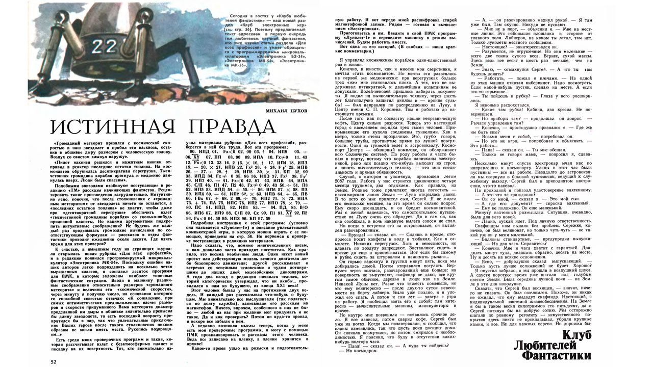 Но просто так программировать не интересно, поэтому в июньском номере ТМ появилась новая рубрика "Клуб электронных игр", первый ее выпуск был в виде довольно неплохого научно-фантастического рассказа, который сопровождался программой для ПМК, позволявшей повторить самостоятельно все события рассказа. Программа называлась "Лунолет -1" и позволяла выполнить мягкую (или не очень) посадку на Луну управляя с помощью калькулятора небольшим космическим кораблем. Публикация произвела настоящий фурор, а "Клуб электронных игр" стал постоянной и одной из самых популярных рубрик журнала.