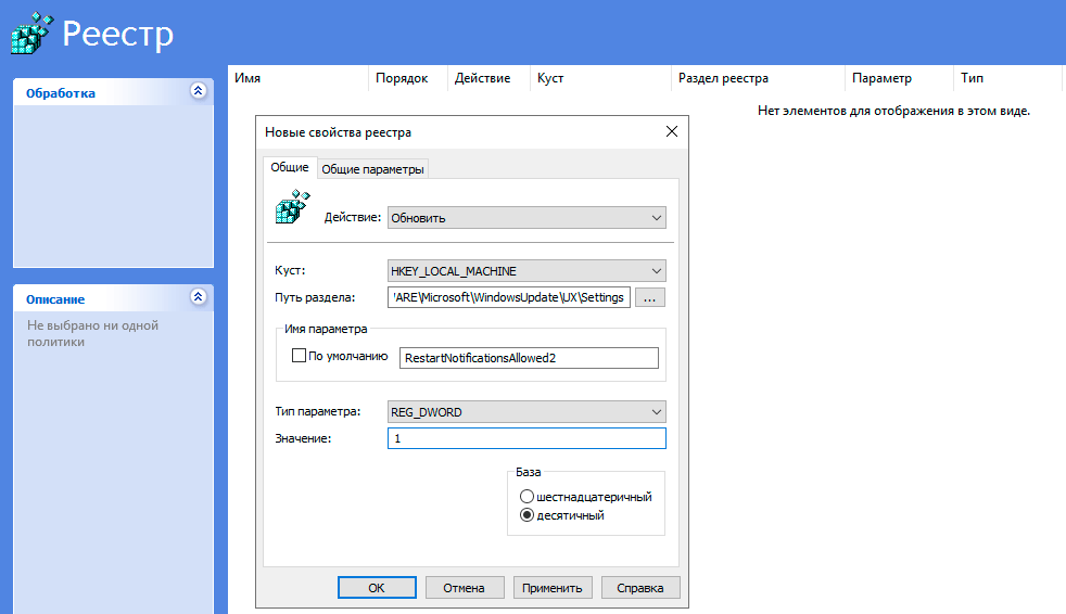 К счастью, настройки реестра тоже можно распространять через GPO. Для этого создадим новую политику, откроем ее на редактирование, перейдем в Конфигурация компьютера - Настройка - Конфигурация Windows - Реестр, где добавим новую запись со следующими значениями полей: