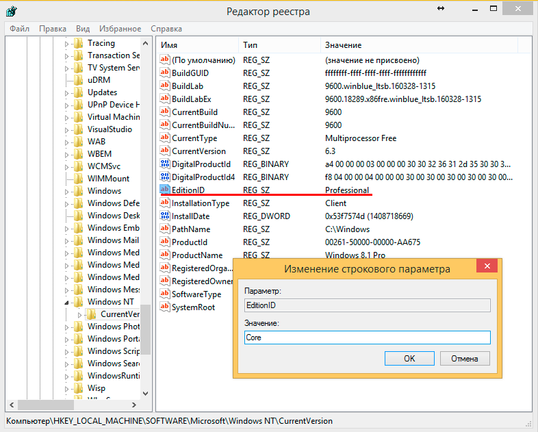 в виде значения параметра EditionID. Для успешного обновления со сменой редакции нам нужно изменить данный параметр таким образом, чтобы он соответствовал редакции целевого дистрибутива.