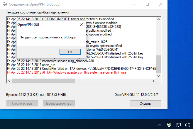 А в чем, собственно, проблема? А в том, что на платформе Windows при установке OpenVPN по умолчанию мы можем иметь только одно активное соединение в один момент времени, при попытке выполнить второе подключение мы получим ошибку: