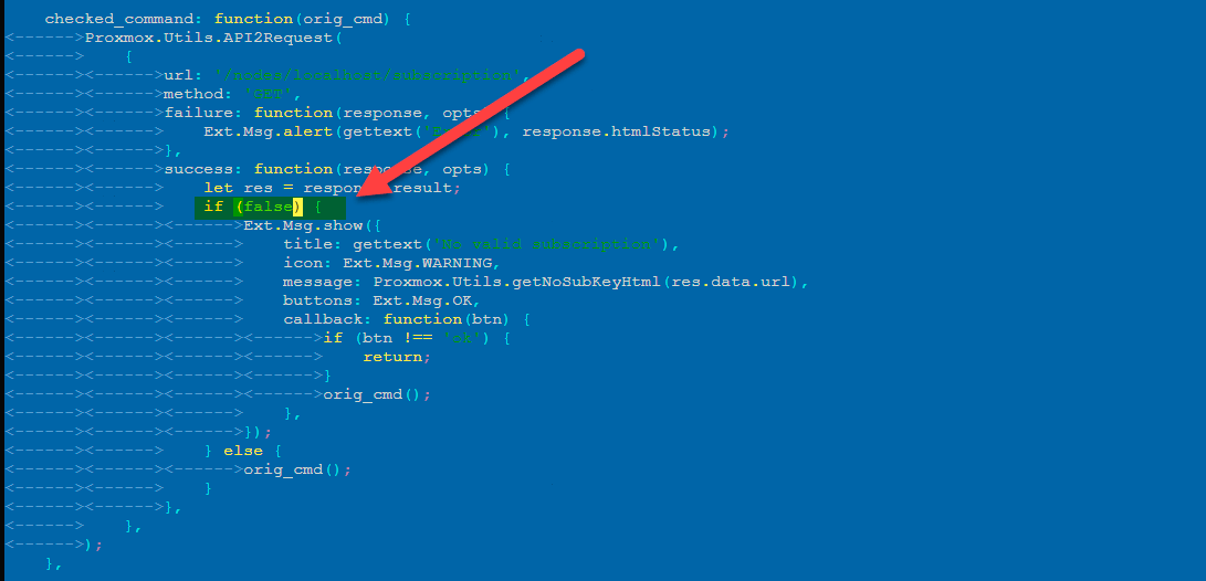 Откроем файл /usr/share/javascript/proxmox-widget-toolkit/proxmoxlib.js и найдем в нем участок кода:
