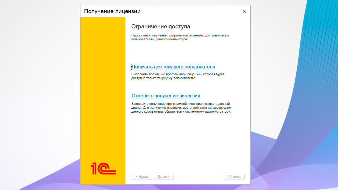 Если вы продолжите получение лицензии в этом режиме, то она будет доступна только текущему пользователю и тот же сервер 1С, который имеет собственную учетную запись такую лицензию не увидит.