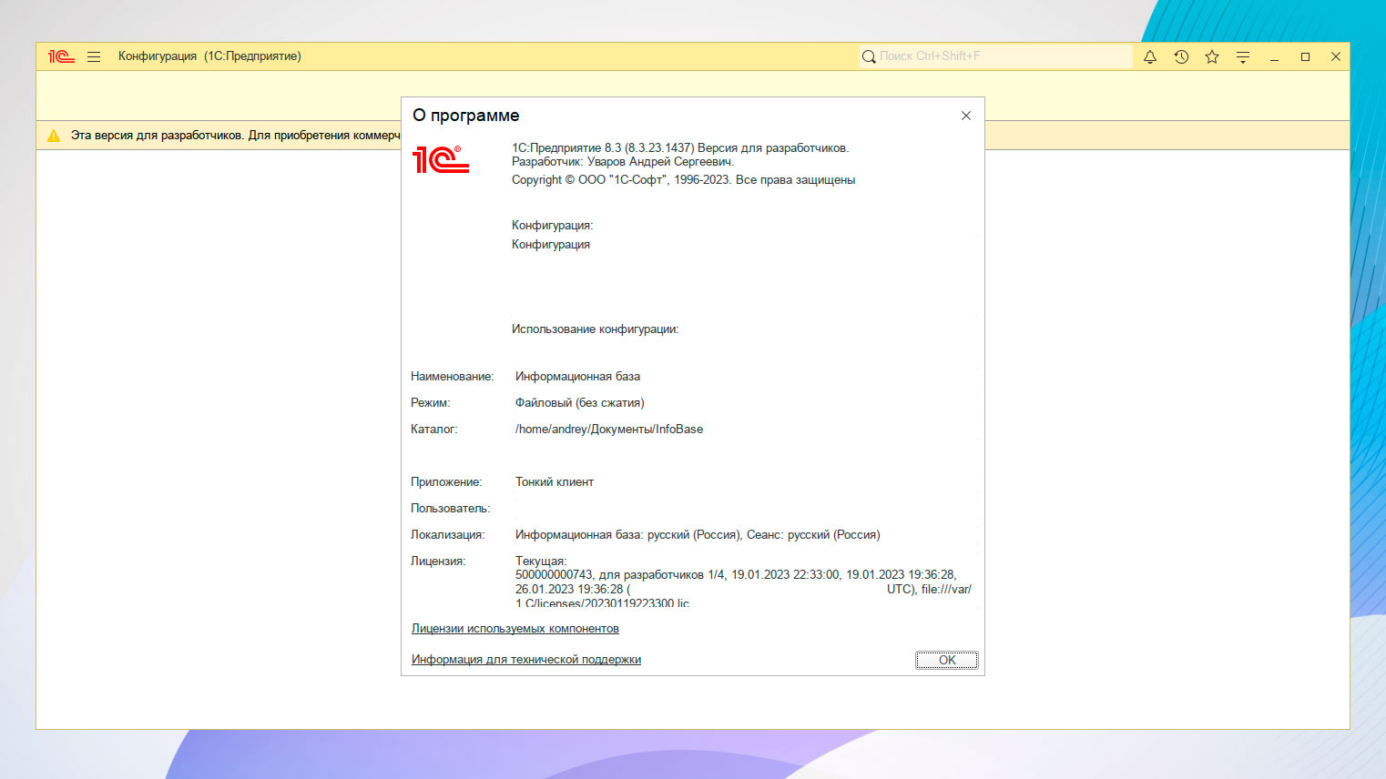 Где 20230119223300.lic - имя файла полученной лицензии. Теперь она может полноценно использоваться всеми экземплярами 1С, запущенными на данном ПК.