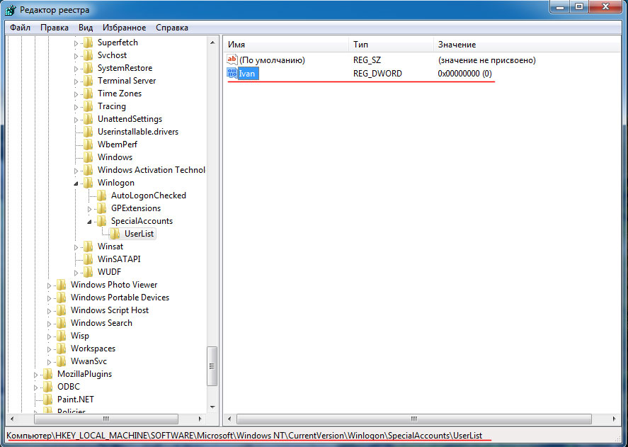 В качестве имени раздела указываем SpecialAccounts, затем внутри этого раздела создаем раздел UserList,** теперь, точно также, создав параметр DWORD с именем пользователя, мы можем скрыть его с экрана приветствия.
