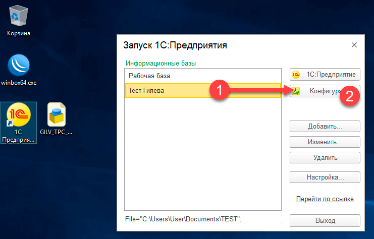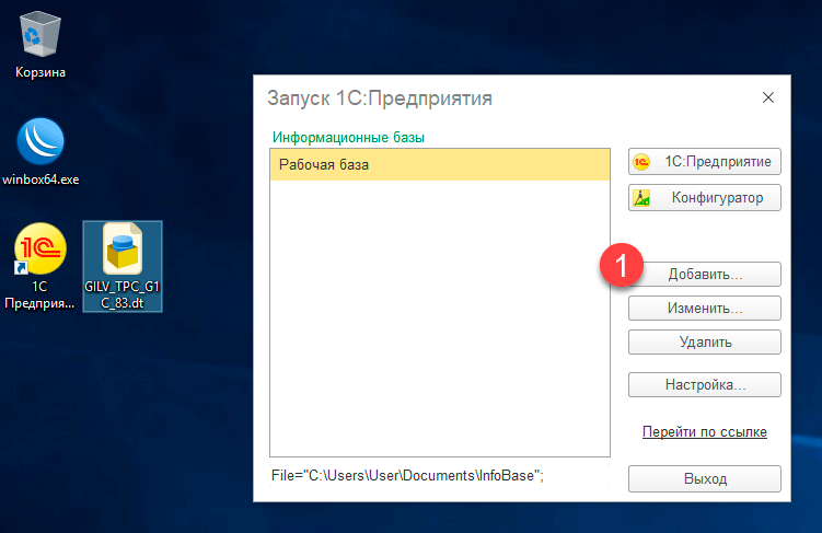 Чтобы установить тест Гилева вам потребуется запустить 1С:Предприятие и создать новую информационную базу нажав на кнопку Добавить.