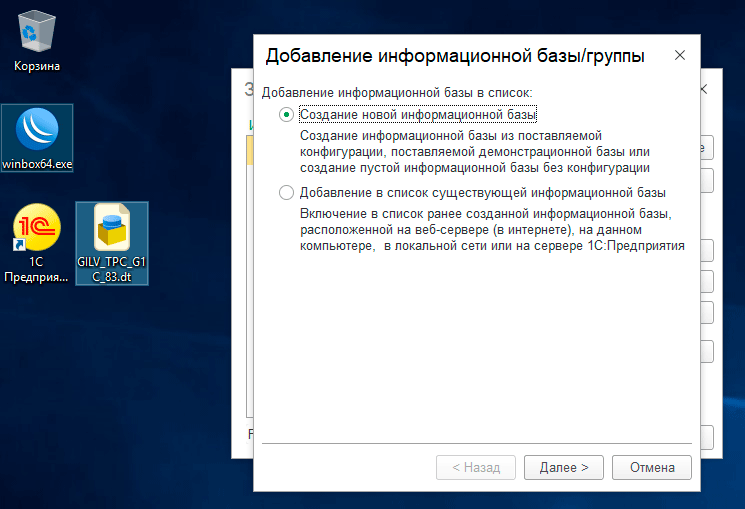 В открывшемся окне следует выбрать Создание новой информационной базы: