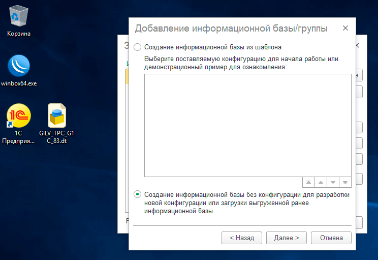 Затем Создание информационной базы без конфигурации, что создаст чистую базу пригодную для заливки дампа.