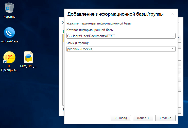В наименовании можете указать все, что вам угодно, а далее предстоит выбрать в каком варианте вы хотите развернуть информационную базу с тестом: в файловом или клиент-серверном. Понятно, что тестировать нужно в том же режиме, в котором предполагается дальнейшая эксплуатация 1С:Предприятие.