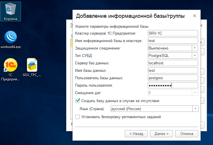 В клиент-серверном варианте вам потребуется указать параметры доступа к кластеру серверов 1С (даже если у вас один единственный сервер, то в терминологии 1С - это все равно кластер серверов) и серверу СУБД, в целом ничего сложного, данные ниже приведены сугубо для примера.