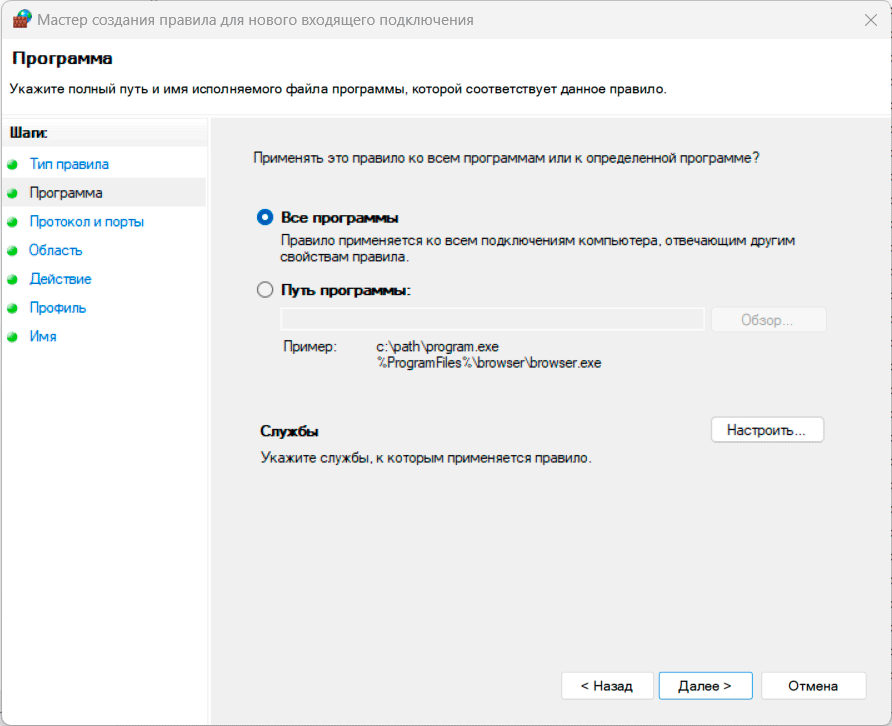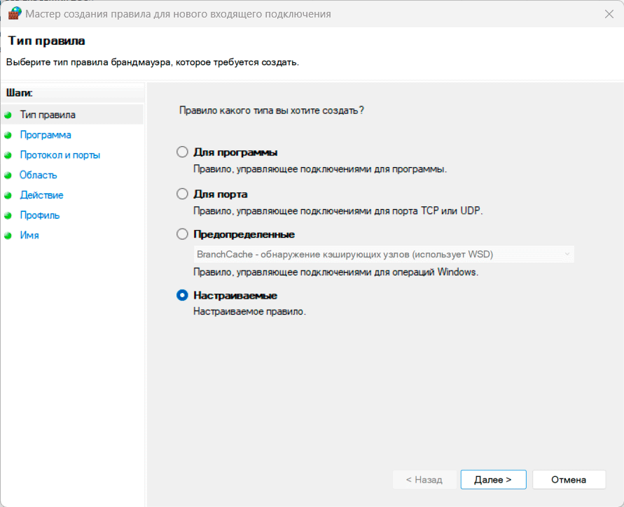 Теперь перейдем к самому созданию правил, на выбор предлагается несколько шаблонов: Для программы, Для порта, Предопределенные. Если ничего из этого не устраивает - то выбираемНастраиваемые и задаем все критерии самостоятельно.