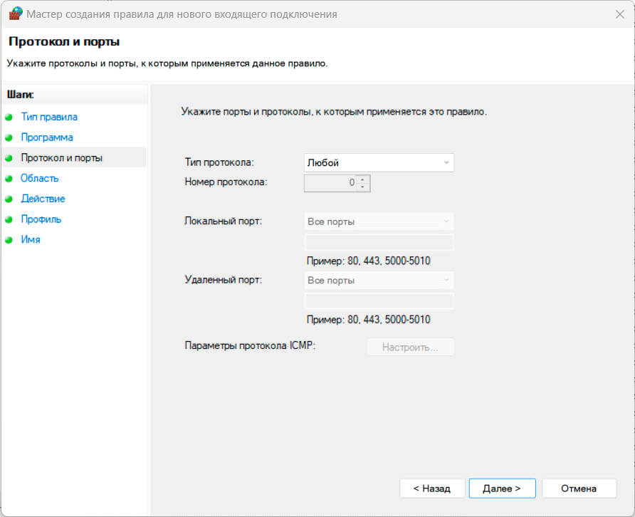 Следующий шаг - Протокол и порты, тут все уже более-менее привычно, выбираем требуемый протокол из списка или указываем его номер, ниже задаем локальные и удаленные порты (если это применимо к выбранному протоколу). И снова сталкиваемся с собственной "терминологией" Microsoft, помним, что для входящих подключений локальный порт - это порт назначения, а удаленный порт - порт источника, для исходящих, соответственно, наоборот.