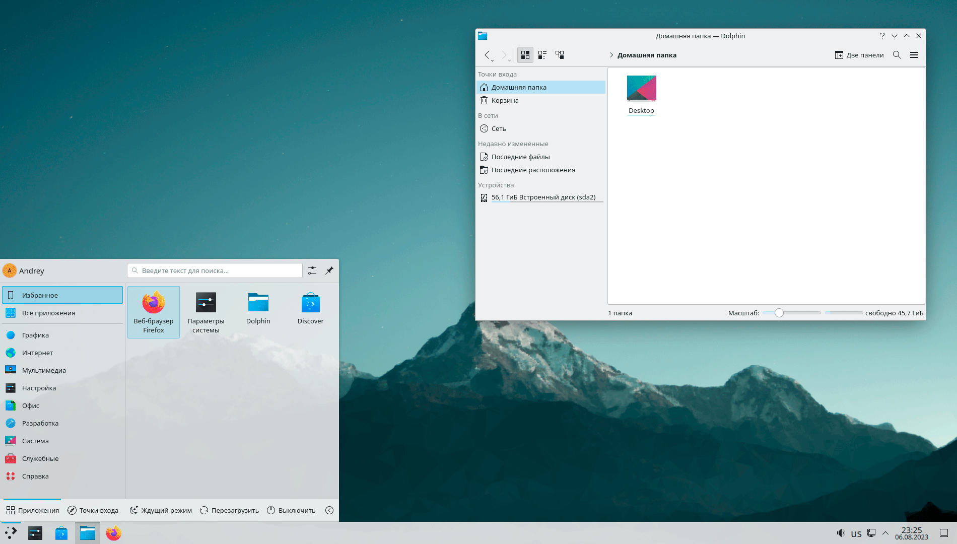 В новой системе нас встречает свежая Plasma в весьма минималистичном исполнении: минимум предустановленных программ и даже нет стандартных папок в домашней директории.