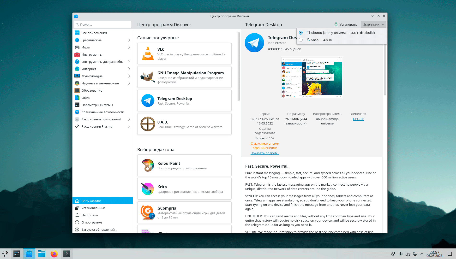 Все остальное нужно ставить самостоятельно, из источников доступны репозитории Ubuntu 22.04 LTS, Snap и Flatpak в различных сочетаниях. По умолчанию используется версия из репозитория (если доступна), поэтому будьте внимательны и всегда проверяйте источник пакета, особенно если вам нужна именно последняя версия.