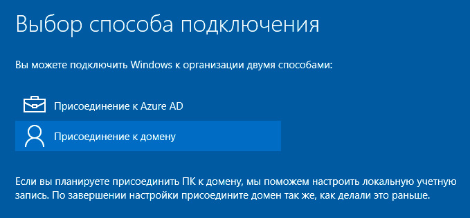 Начинать, так по порядку. Выбираем принадлежность к организации, нам сразу же предлагают присоединить ПК к домену или Azure AD (облачным службам Microsoft для корпоративных клиентов).