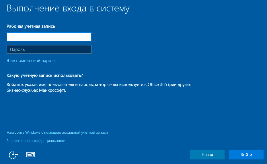 Если выбрать присоединение к Azure AD, то нас попросят ввести учетные данные к Office 365 или иным бизнес-службам Microsoft (не путать с учетной записью Microsoft ) или настроить локальную учетную запись.