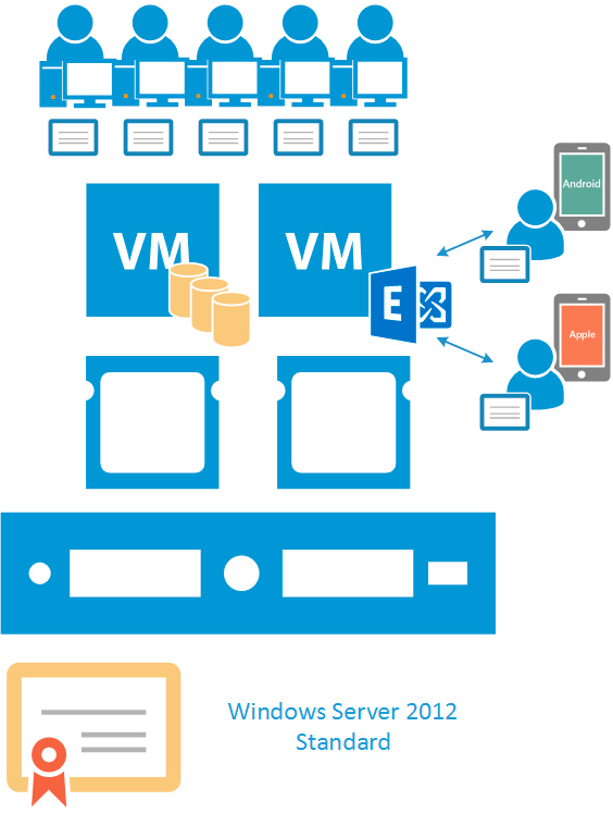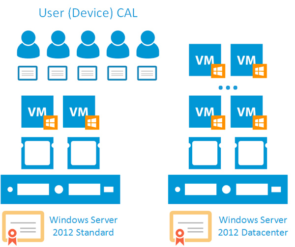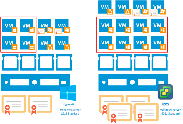 В левой части у нас имеется четырехпроцессорный хост под управлением Windows Server, по общему правилу сначала следует лицензировать все процессорные сокеты, поэтому нам потребуется две серверных лицензии, вне зависимости от редакции. В нашем случае это будет Standard, что дает нам право на запуск четырех виртуализированных экземпляров Server 2012. Понятно, что запускать четыре виртуальных машины на четырехпроцессорном сервере никто не будет, поэтому следует докупать серверные лицензии Standard на каждые две виртуальные машины. Также вы можете использовать без каких-либо ограничений виртуальные машины с Linux и *nix системами или предыдущие версии Windows Server, при наличии соответствующих лицензий на них.