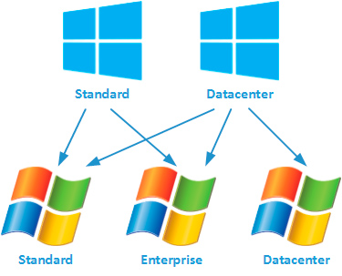 Также существенно изменились правила использования предыдущих версий (downgrade). Если раньше OEM версии позволяли понижать выпуск только для предыдущего, то теперь это ограничение снято, вы можете использовать любую предыдущую версию. Редакция Datacenter позволяет использовать любые редакции предыдущих выпусков, Standard только Standard и Enterprise.