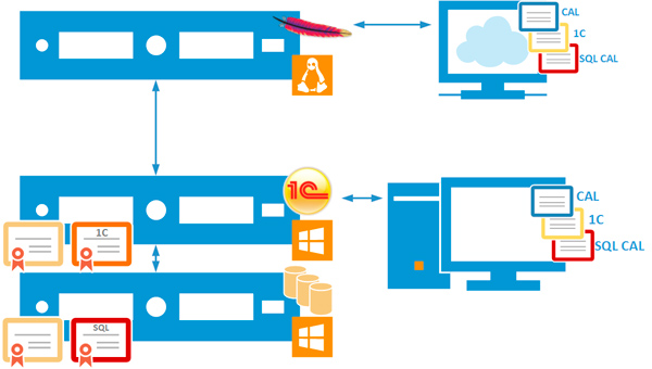 Исходя из этих же принципов мы обязаны снабдить удаленных клиентов тем же самым набором лицензий, несмотря на то, что непосредственно с серверами на Windows они не взаимодействуют, а обращаются только к Linux машине.