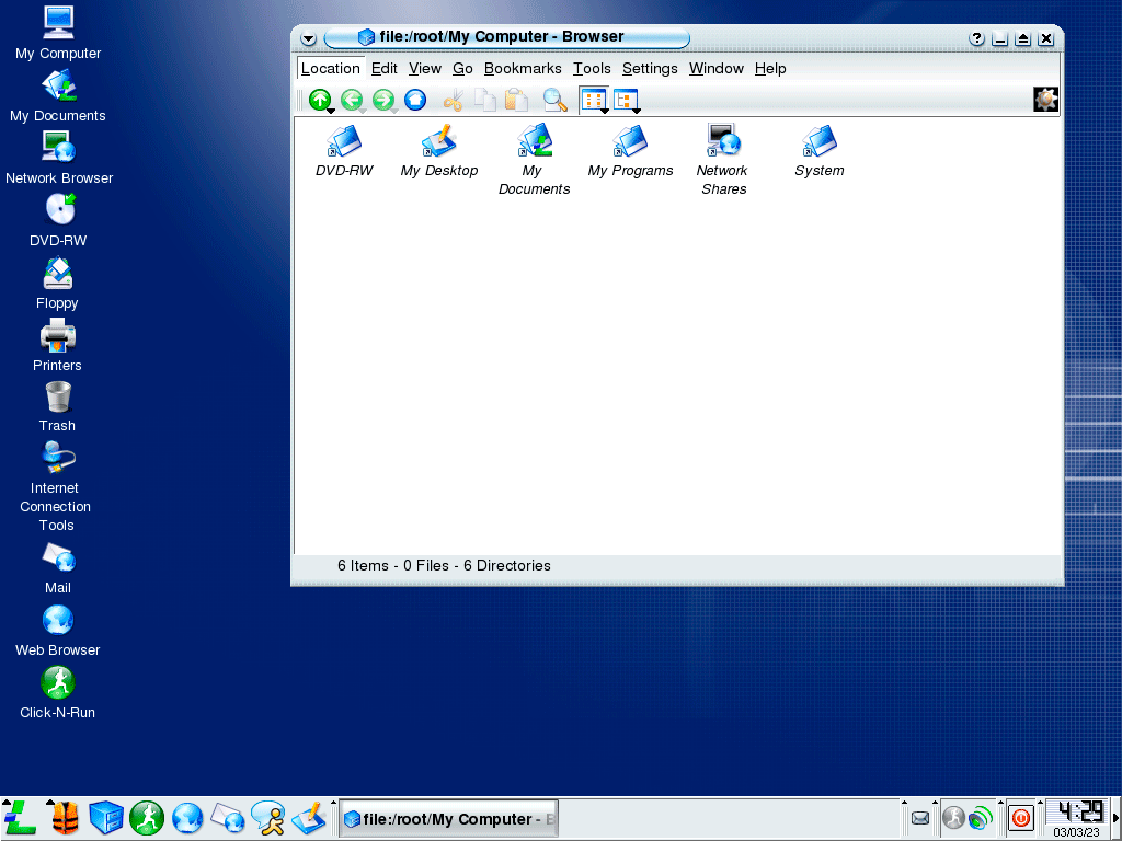 В остальном перед нами типичный рабочий стол с окружением KDE 3 куда вынесены привычные пользователю Windows значки, файловая система тоже организована с оглядкой на Microsoft, но сделано это при помощи символических ссылок, что только больше запутывает, чем облегчает доступ к данным. Вместо того, чтобы познакомить пользователя с организацией хранений данных в Linux разработчики, наоборот, решили его от этого огородить.
