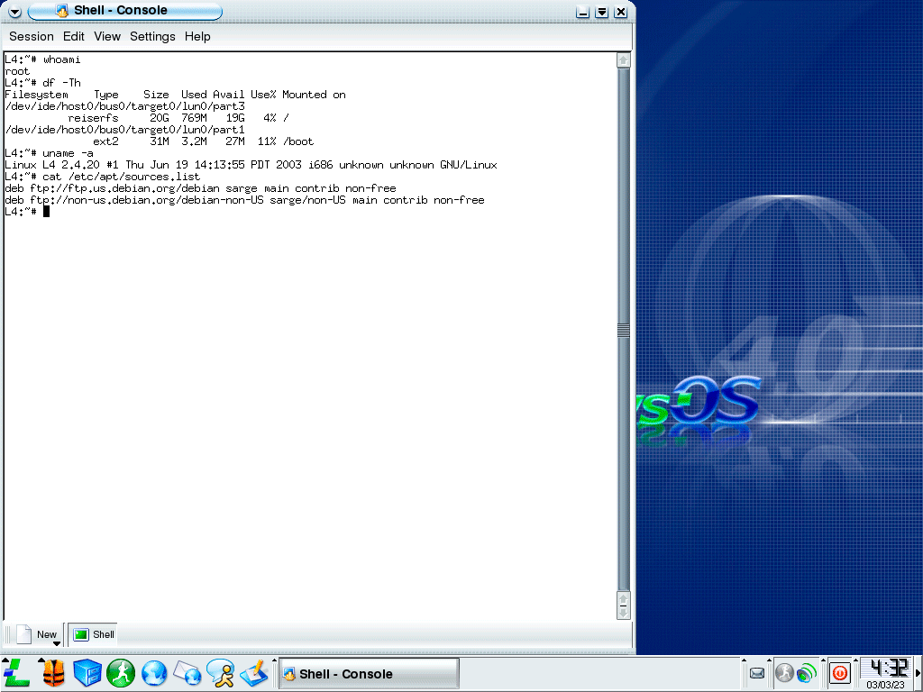 А что вообще под капотом? Давайте посмотрим: ядро 2.4.20 и репозитории от Debian Sarge, который на тот момент был в состоянии testing и официально вышел только в 2005 году. Активный пользователь действительно root, а файловая система расположена в одном разделе и применяется ReiserFS.