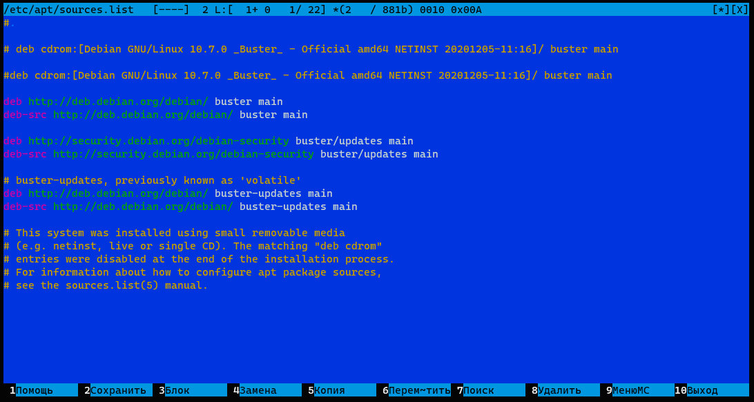 Затем перейдем к основному списку репозиториев /etc/apt/sources.list, по правилам хорошего тона туда не следует добавлять своих записей, но может быть всякое, поэтому внимательно изучаем содержимое этого файла. В нем должны остаться три стандартных репозитория и шесть строк, по две строки на каждый. Ниже приведен их список для Debian 10: