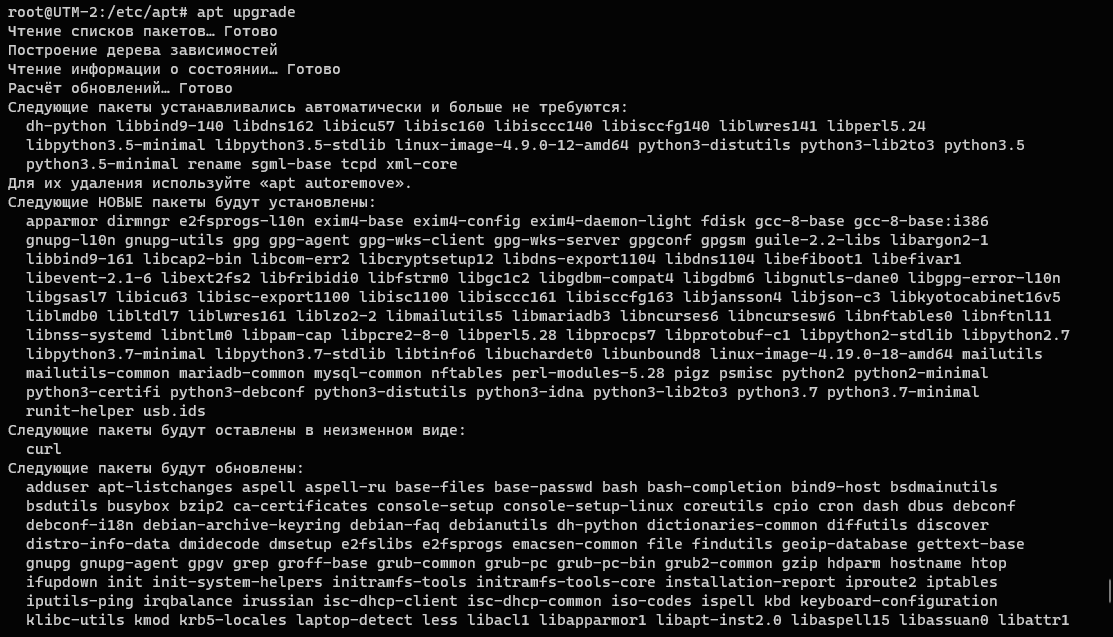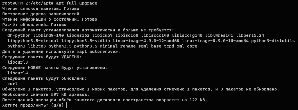 Перед тем, как подтвердить выполнение команды, обращаем отдельное внимание на те пакеты, которые будут оставлены в неизменном виде, в нашем случае этоcurl, для их обновления потребуется что-то удалить из системы и это не всегда допустимо.