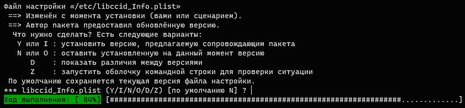 В процессе обновления к нам может поступить запрос на перезапись конфигурационных файлов. Здесь следует придерживаться следующих правил: если конфигурационный файл меняли вы, то лучше оставить его исходную версию, если нет - то принять изменения. В случае сомнений можно просмотреть изменения нажав клавишу D, выйти из режима просмотра можно по клавише Q.