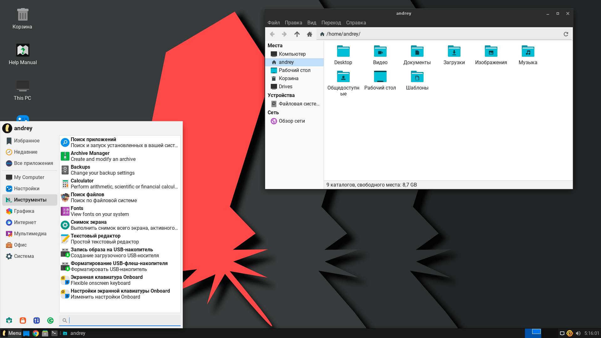 В качестве рабочей среды используется XFCE 4.16 - разумный выбор между легковесностью и возможностями. Организация рабочего пространства и расположение элементов интерфейса выполнены так, чтобы максимально повторять классический интерфейс Windows, но при этом нет попытки мимикрировать под Windows. Мы сразу видим, что перед нами Linux, но с максимально привычной рабочей средой. Внешнее оформление неплохо проработано, система выглядит неброско, но аккуратно и современно.