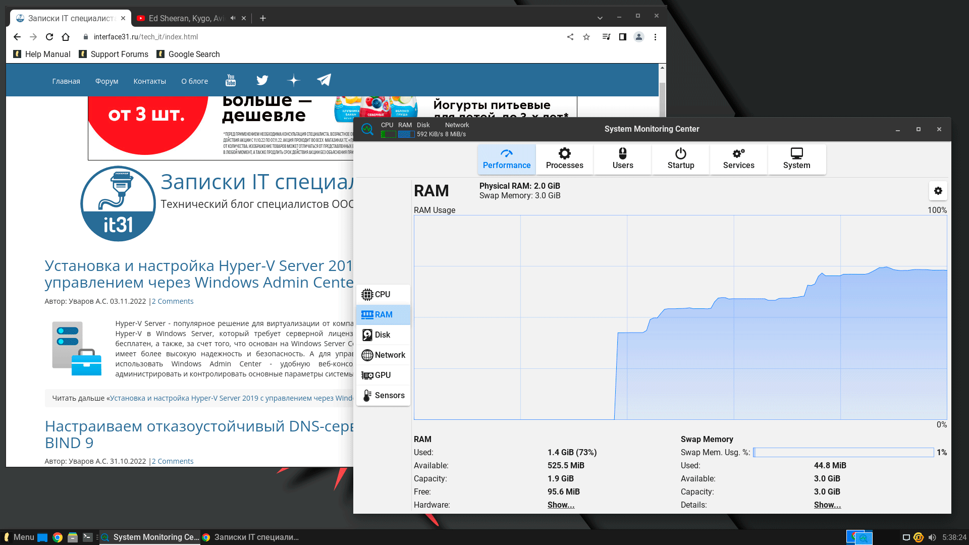 А что у нас с потреблением ресурсов? Все это время мы не замечали никаких проблем с производительностью, система работала быстро, хорошо, отзывчиво. Но 2 ГБ - это очень небольшой объем и каких-то чудес ждать не стоит, основным потребителем памяти сегодня является браузер, мы открыли две странички - наш сайт и ролик HD на Youtube - и сразу же стало понятно, что сильно не развернешься. Любителям открывать десятки вкладок придется туго, но при разумном подходе можно вполне комфортно работать в сети. Кстати, в качестве браузера по умолчанию в системе представлен Google Chrome.