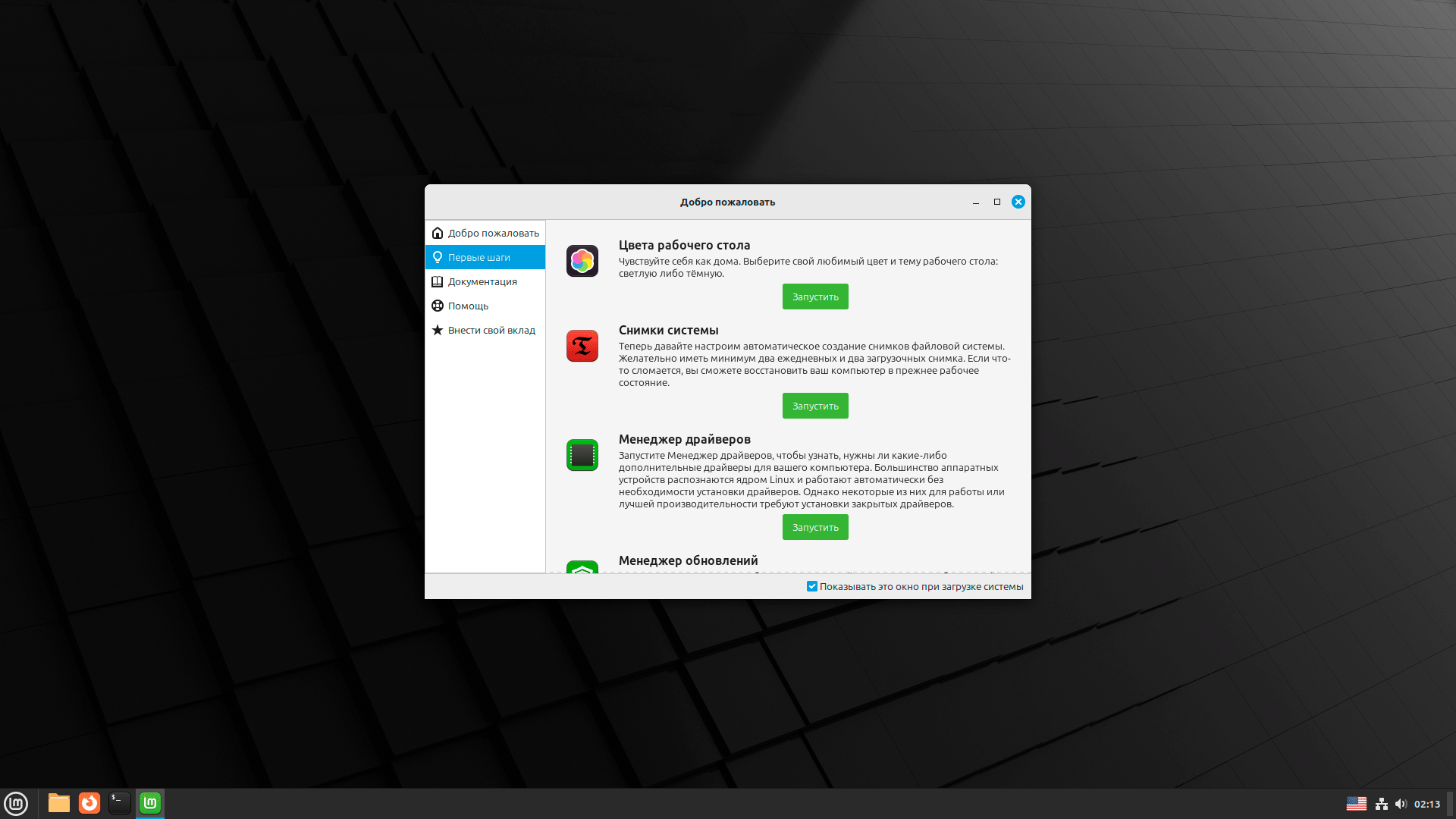 После входа в систему нас встречает окно с заголовком Добро пожаловать, но в отличие от других систем оно максимально сконцентрировано на самых важных первоначальных действиях, начиная от кастомизации. И не нужно смеяться, очень и очень многие пользователи первым делом именно кастомизируют систему. Затем предлагается настроить резервное копирование в виде снимков Timeshift, установить драйвера и выполнить обновление системы. При этом не надо лезть в настройки, что-то искать - все находится прямо перед глазами.