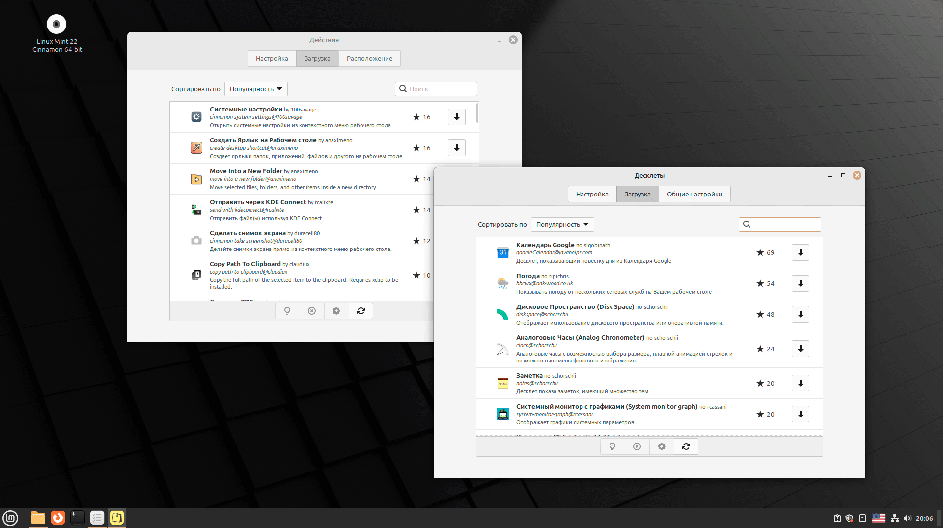 Но это только первый взгляд, на самом деле Cinnamon очень гибкая оболочка, в которой буквально каждый элемент можно изменить под себя, для этого предназначены Cinnamon Spices (специи), которые представляют собой наборы расширений, затрагивающие различные элементы оболочки. В Spices входят пять основных разделов: Темы, ну тут все понятно, Действия - расширения пунктов контекстного меню файлового менеджера, Десклеты - мини-приложения рабочего стола.