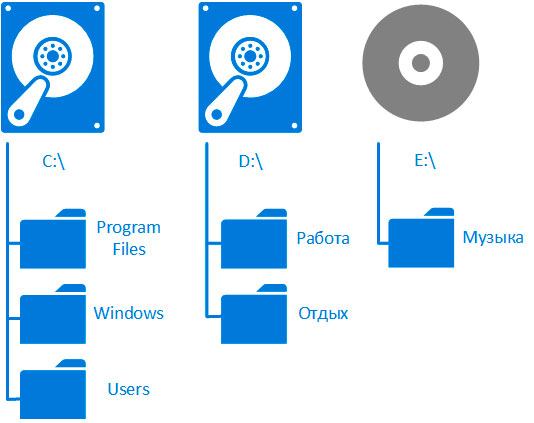 В основу файловой системы Windows положен диск, символизирующий собой отдельное устройство хранения информации. При этом каждый диск содержит свою собственную файловую систему, корень которой составляет он сам и обозначается буквой. Т.е. запись вида C:\ - обозначает корень файловой системы на диске С, а D:\Работа - папку в корне файловой системы диска D. Подключая к системе новый носитель информации мы получаем еще одну или несколько файловых систем.