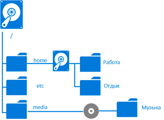 В Linuх концепция принципиально иная. Вспомним: все есть файл, дисковые накопители -- это тоже определенный тип файла. Кроме того, файловая система Linuх иерархична, т.е. имеет один единственный корень, обозначаемый символом /.