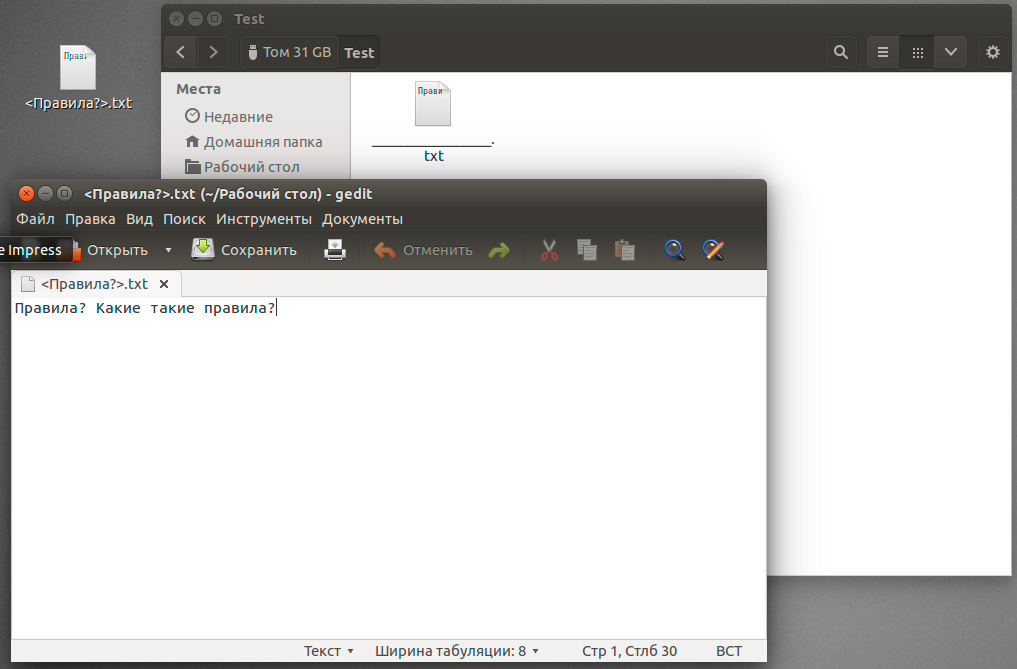Но это не говорит о том, что можно называть файлы, как вам нравится, без оглядки на иные системы, прежде всего Windows. Допустим, мы решили вопреки всем правилам назвать файл <Правила?>, в Linux нам никто не помешает этого сделать, но уже попытавшись скопировать его на флешку с FAT32 нас постигнет наказание, имя файла превратится в набор подчеркиваний.