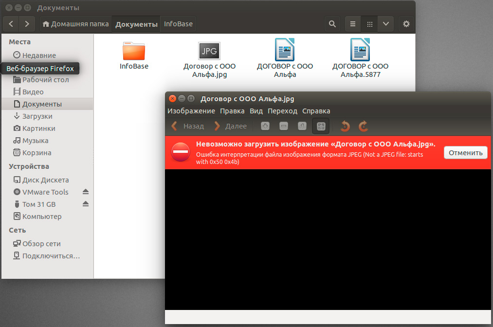Как видим документ LibreOffice успешно определяется последним невзирая на "левое" или отсутствующее расширение, но присвоив ему расширение jpg, мы сопоставим его программе просмотра изображений и получим ошибку при открытии.