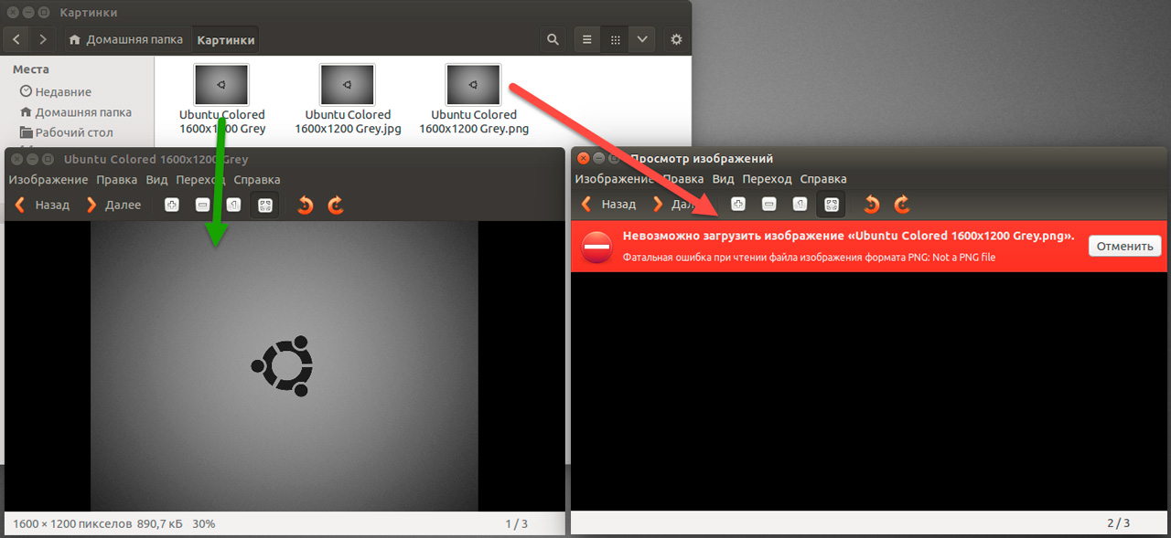 С изображением и иным медиаконтентом связана еще одна особенность, если у файла есть расширение, то система не будет определять его реальное содержимое и будет пытаться открыть его так, как указано в расширении. Простой пример: мы переименовали файл jpg в png, после чего получили ошибку при попытке его открыть, в тоже время тот же самый файл без расширения вообще открывается нормально.
