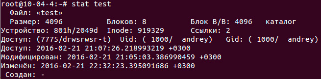 Если установлены несколько признаков, то записывается восьмеричное число аналогичное установленным битам в двоичном формате, например, SUID + sticky это 101 BIN или 5 OCT. Установленный sticky-бит заменяет x на t в группе other. Ниже показан каталог с правами 7775 или rwsrwsr-t, что соответствует установке на него SUID, SGID и sticky-бит одновременно.