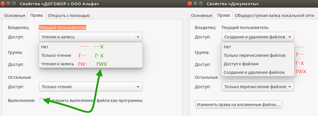 Запись прав может производиться как в символьной, так и в числовой форме, для этого используют двоичное или восьмеричное (что удобнее) значение установленных битов.