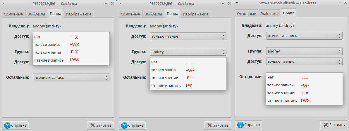 В XFCE не потрудились задать понятные и логичные наборы для файлов и папок, ограничившись стандартным перечислением, включая бесполезные -w- и -wx, также отсутствует явное указание признака "исполняемый", вместо этого флаг x автоматически добавляется к любому набору прав владельца.