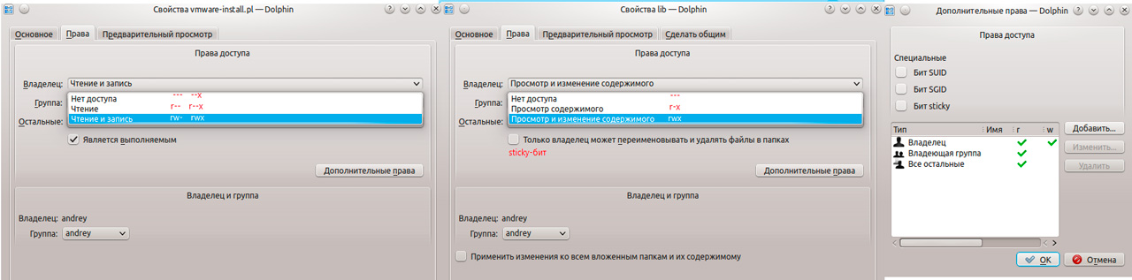 И наконец KDE сочетает достаточно лаконичный основной набор прав с возможностью установки признака "исполняемый" для файлов и sticky-бит для папок с возможностью явно указывать особые признаки в дополнительных настройках.