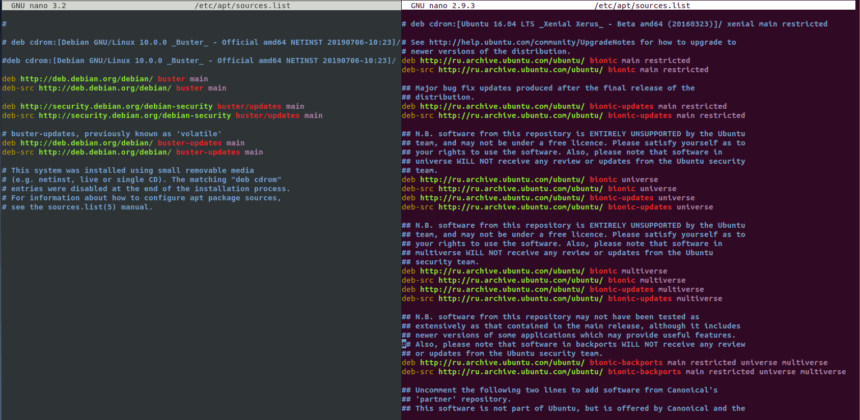 Список подключенных репозиториев хранится в /etc/apt/sources.list, ниже показано содержимое этих файлов в Debian 10 (слева) и Ubuntu 18.04 (справа).
